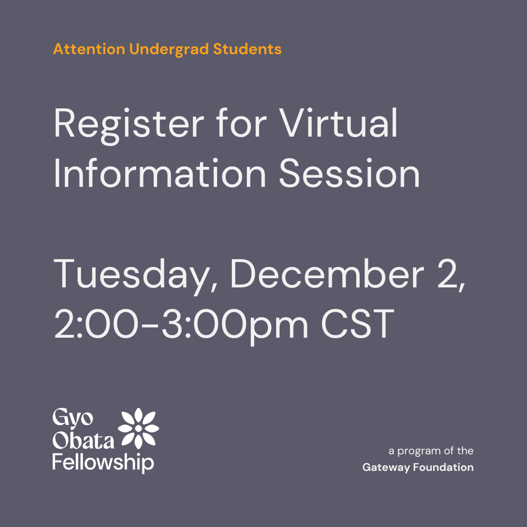 While the Gyo Obata Fellowship is intended for students from backgrounds underrepresented in public arts administration and the arts community at large, the Gateway Foundation encourages eligible candidates from all backgrounds to apply for consideration. The Gateway Foundation is an equal opportunity employer and does not discriminate on the basis of any protected trait under the law.