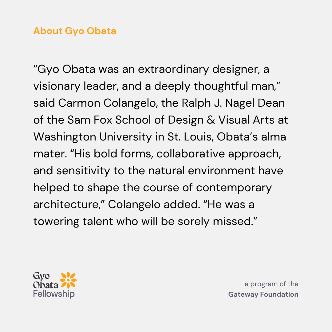 In honor of his 20+ years as a board member, the Gateway Foundation has created a program to offer students direct experiences with local arts institutions. The Gyo Obata Fellowship immerses students in the work of arts administration, introducing this field to those who may never have considered it a career pathway. The Gateway Foundation believes that advancing opportunities in arts and arts management for underrepresented professionals has the potential to bring new and broader perspectives to both institutions and those working within them.