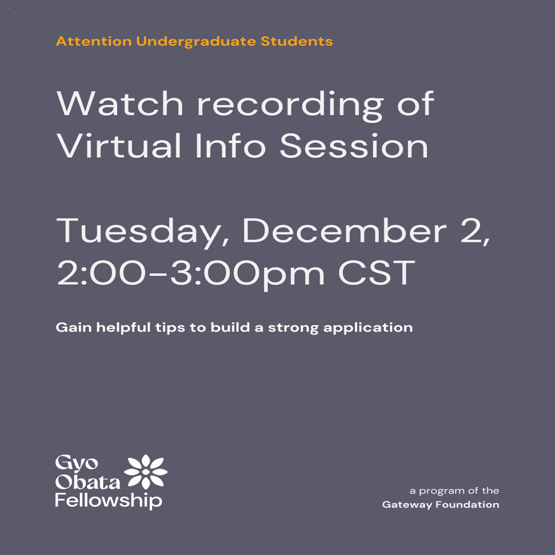 While the Gyo Obata Fellowship is intended for students from backgrounds underrepresented in public arts administration and the arts community at large, the Gateway Foundation encourages eligible candidates from all backgrounds to apply for consideration. The Gateway Foundation is an equal opportunity employer and does not discriminate on the basis of any protected trait under the law.